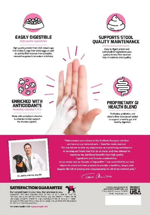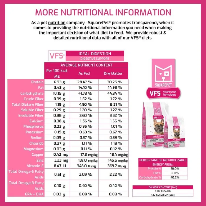 SquarePetยฎ VFSยฎ Ideal Digestion has been designed by SquarePetโs team of veterinary professionals to support digestive health. VFSยฎ Ideal Digestion is made with cage free turkey from South Dakota and cage free whole eggs from California to create a highly palatable and easily digestible diet perfect for sensitive stomachs.