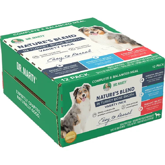 The Dr. Marty Wet Food Variety Pack contains 4 each of our three amazing formula's! Nature's Blend - Essential Wellness in Turkey Bone Broth, which supports your dog's easy digestion, youthful energy, and overall wellness. Nature's Blend - Sensitivity Select has proteins known for their skin- and coat-supporting nutrients like pollock, beef heart, tuna, salmon, and salmon oil, which are naturally full of omega-3s and biotin. This formula is perfect for dogs who need extra skin and coat nourishment. Finally, Nature's Blend - Radiant Select in Turkey Bone Broth has selected proteins known for their skin- and coat-supporting nutrients like pollock, beef heart, tuna, salmon, and salmon oil, which are naturally full of omega-3s and biotin. This formula is perfect for dogs who need extra skin and coat nourishment. Try all three and let your dog pick their favorite!