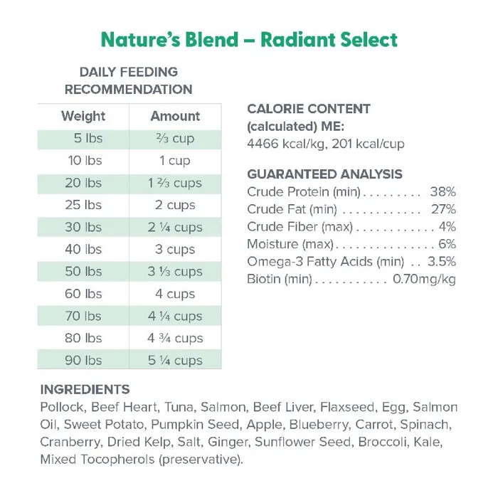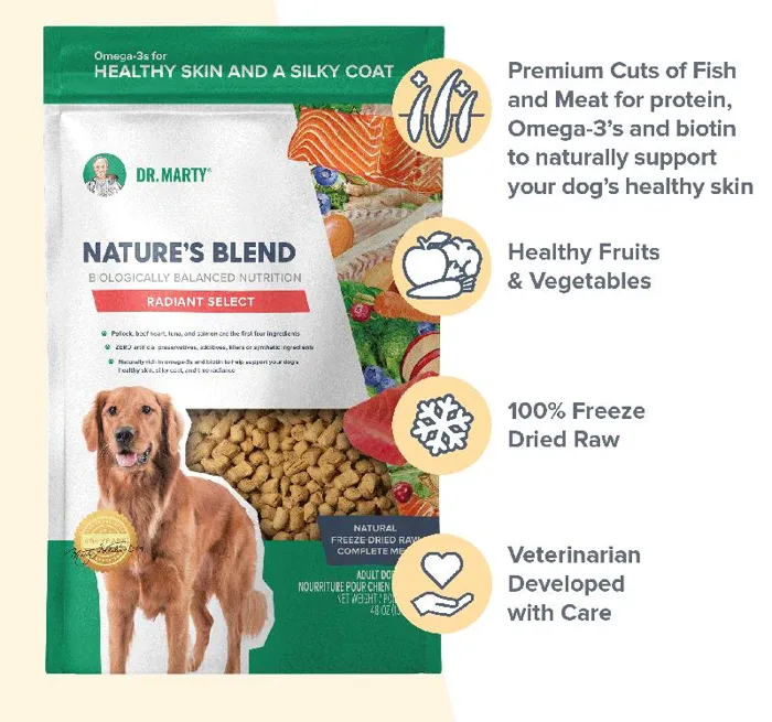 Dr. Marty Nature's Blend Radiant Select Freeze Dried Raw Dog Food is a premium blend designed to give your dog nutritional support for a healthy skin and coat. Crafted by Dr. Marty, one of the world's leading veterinarians for over 40 years, his recipes are bursting with flavor and packed with nutrition. Each batch is made with Omega-3-rich Pollock and Salmon, protein-rich organ meats, and antioxidant-rich veggies and fruits to help support your dog's skin, coat, and overall wellbeing.