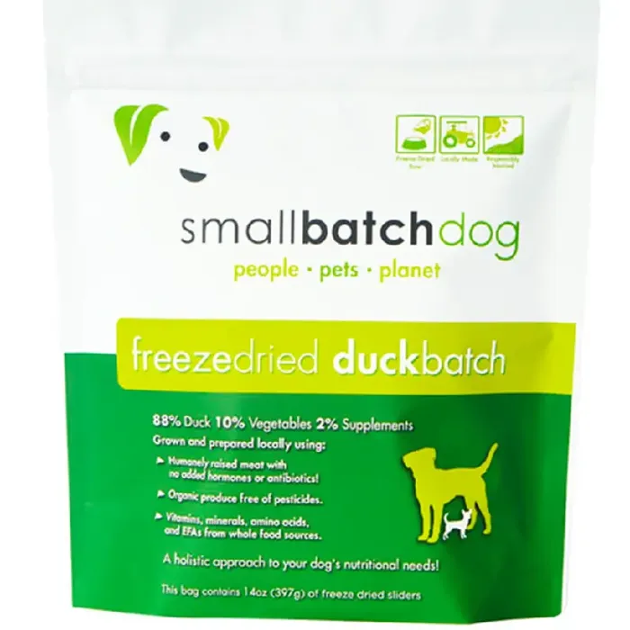 Smallbatch Duck Sliders provide dogs with wholesome, raw food. This recipe is made with 88% meat (including muscle meat, organs and bone), 10% produce and 2% supplements. The meat is free-range, pasture raised and always free of hormones and antibiotics. Smallbatch only uses 100% certified Organic fruits and vegetables and the supplements are always pure, organic, and unrefined. The ingredients are gently freeze-dried to ensure the nutrients are protected. No HPP (high pressure pasteurization), only freeze-dried raw ingredients. This recipe is proudly made in California.