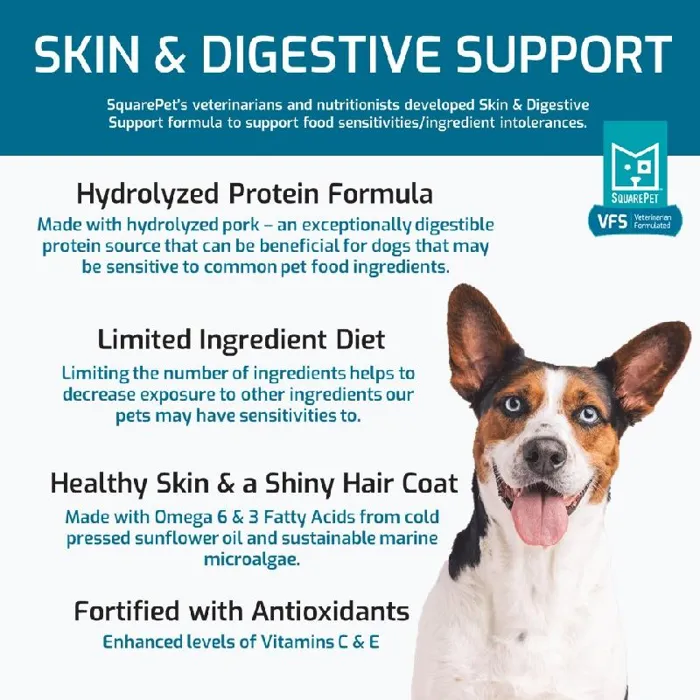 SquarePetยฎ VFS Skin & Digestive Support formula has been designed by SquarePetโs team of veterinary professionals to support food sensitivities/ingredient intolerances. VFS Skin & Digestive Support formula for dogs is a unique, limited ingredient, hydrolyzed protein dog food. Similar to proteins used in some infant formulas, hydrolyzed proteins are proteins that have been broken down into smaller components. The result is an exceptionally digestible protein source that can be beneficial for dogs that may be sensitive to common pet food ingredients.